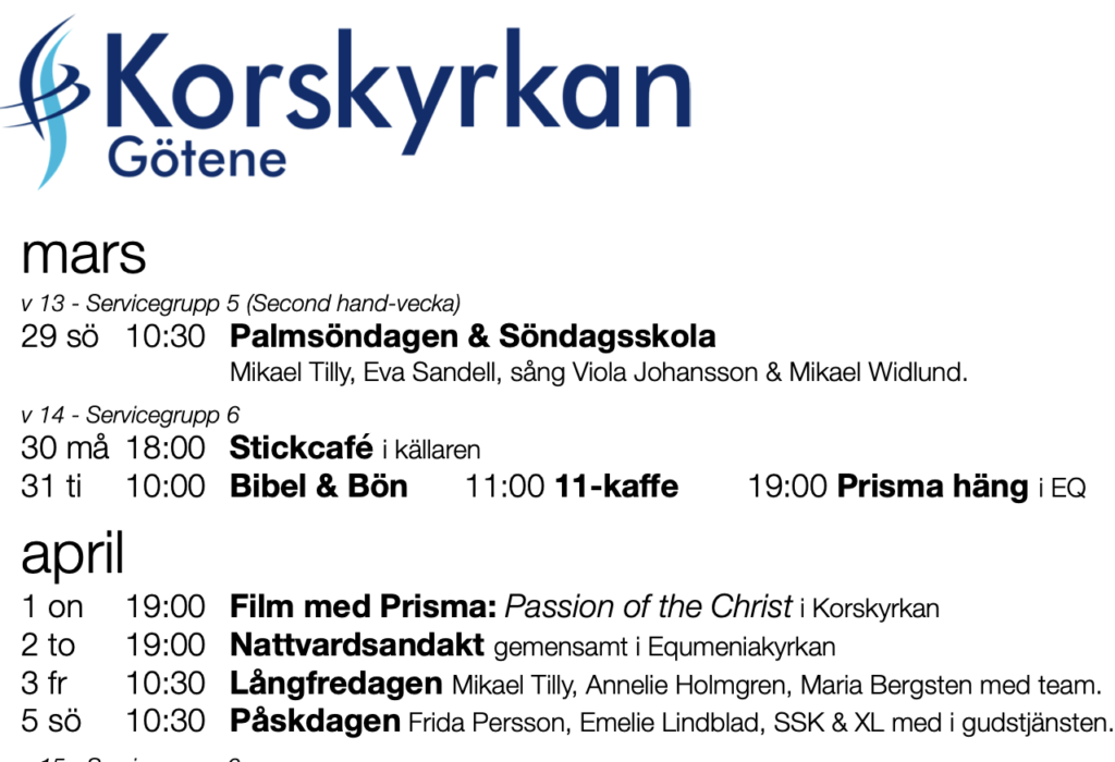 Besök av Goda Nyheter, sång med Emelie & Jerker med team. Söndagsskola…
